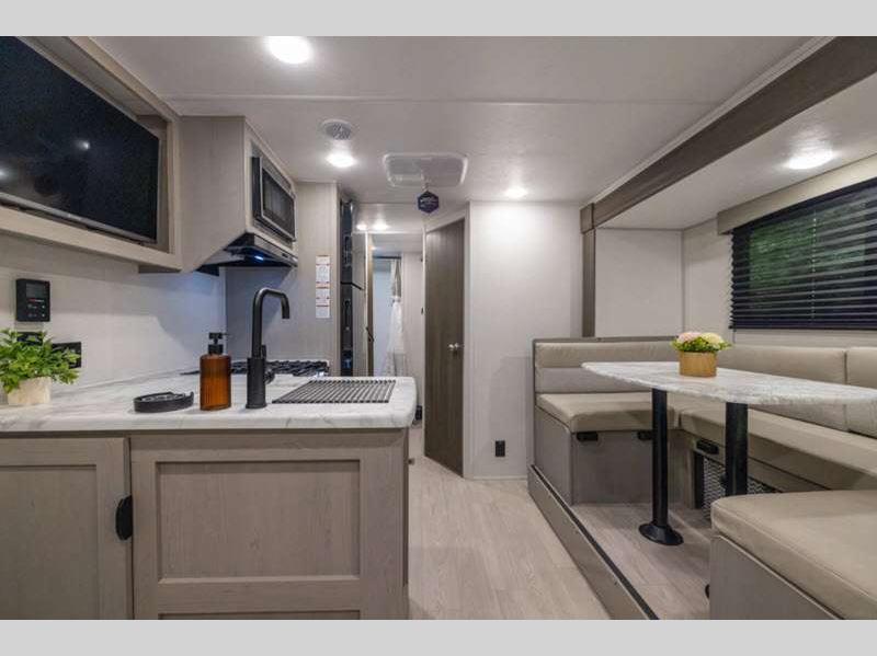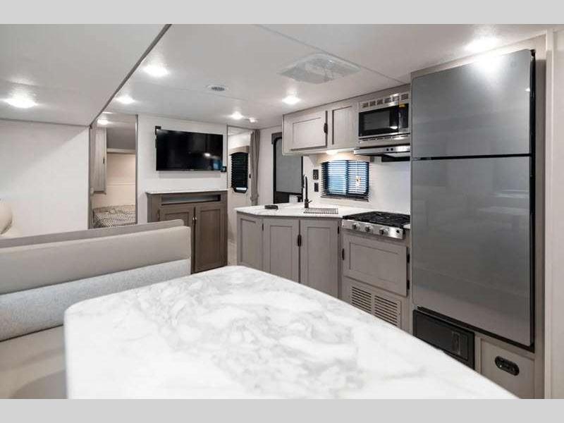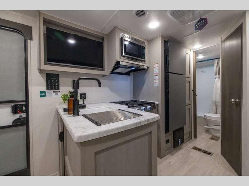 Sleeps 5 Slides 1 Length 30 ft 9 in Ext Width 8 ft Ext Height 10 ft Hitch Weight 740 lbs GVWR 7740 lbs Dry Weight 5865 lbs Cargo Capacity 1872 lbs Fresh Water Capacity 40 gals Grey Water Capacity 69 gals Black Water Capacity 32 gals Furnace BTU 30000 btu Available Beds RV Queen Refrigerator Type 12 Volt Refrigerator Size 10 cu ft Cooktop Burners 3 Shower Size 36" x 30" Number of Awnings 1 Water Heater Type Tankless On Demand AC BTU 13500 btu TV Info LR Smart TV Awning Info 21' Power with LED Light Strip & Adj. Legs Axle Count 2 Washer/Dryer Available Yes Shower Type Tub/Shower Combo Similar Floorplans