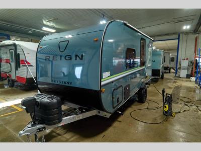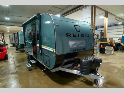The Reign travel trailers by Keystone are premium single-axle units that are sure to make an impression at the campground. Each one is built with an exclusive automotive-finished aluminum exterior, a walkable roof, and a 100% composite floor for added durability. There are also tinted safety glass windows, quick drop stabilizer jacks, and an exterior shower with hot and cold water. The European inspired interior design is unique and cozy, and the 78" interior height will give you plenty of space to move about. You will also enjoy the ultra bright LED light strip and solid surface countertops in the kitchen, along with blackout night shades, and many more interior comforts.