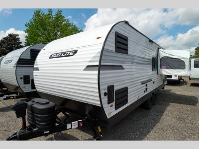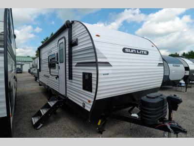 This toy hauler features up to 13' 3" of cargo space that can easily be loaded using the 88" x 82" rear ramp door. Once unloaded, set up with the fold-down 60" x 74" bed that will make for a great night's rest. There is also a fold down dinette that can transform into added sleeping space at night. The kitchen amenities will make it easy to create a warm meal using the three-burner stove or microwave oven, and you can get cleaned up and refreshed in the bathroom with the shower and toilet. And when the optional tent bed is added on this model, you can sleep more campers! You can trust the build and enjoy your experience with any one of these Sunset Park RV Sun Lite travel trailers! Their aerodynamic profile is not only easy to haul, but also saves on fuel. They are built to withstand years of traveling even though they are lightweight with a diamond plate rock guard, a one piece PVC roof membrane, Dexter Spring-Leaf axles, and tinted safety glass windows. Some comfort standards you are sure to enjoy are the two-burner stove top range with hood, light and fan, plus the refrigerator and microwave, and an outside shower to help keep the dirt outdoors where it belongs. We have 1 24THX availableView InventorySpecificationsSleeps 3 Length 24 ft 6 in Ext Width 8 ft Ext Height 10 ft 7 in Int Height 6 ft 6 in Interior Color Grotto Hitch Weight 560 lbs Dry Weight 4170 lbs Cargo Capacity 4570 lbs Fresh Water Capacity 36 gals Grey Water Capacity 28 gals Black Water Capacity 28 gals Available Beds RV Queen Cooktop Burners 3 Number of Awnings 1 Garage Size 13 ft 3 in LP Tank Capacity 20 lbs Water Heater Capacity 6 gal Water Heater Type DSI Gas Awning Info Power Axle Count 1 Number of LP Tanks 2 Shower Type Tub/Shower Combo Similar Toy Hauler Travel Trailer Floorplans