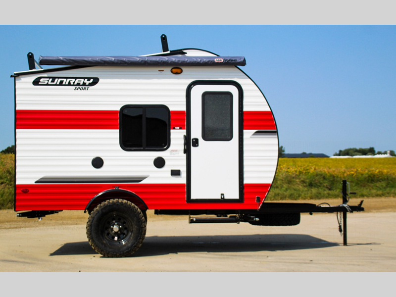 Sunray 109  Sunset Park RV Sunray travel trailer 109 Sport highlights: Outdoor Kitchen ... more about Sunray 109 Have a question about this floorplan? Contact Us SpecificationsSleeps 2 Length 12 ft Ext Width 8 ft 6 in Ext Height 7 ft 6 in Int Height 4 ft 6 in Interior Color Grotto, Gray, Red, Turquoise Exterior Color White, Gray, Red, Black, Blue, Yellow, Orange Hitch Weight 215 lbs Dry Weight 1440 lbs Fresh Water Capacity 16 gals Cooktop Burners 2 LP Tank Capacity 20 lbs Water Heater Capacity 6 gal Water Heater Type DSI Gas Axle Count 1 Number of LP Tanks 1 Similar Floorplans